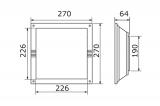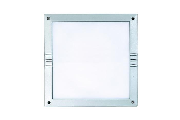 Vierkantig plafond- of wandarmatuur in gegoten aluminium. UV- en corrosiebestendige polyester coating. Polycarbonaat diffuser. Aluminium reflector. Siliconen pakking. Roestvrijstalen schroeven.